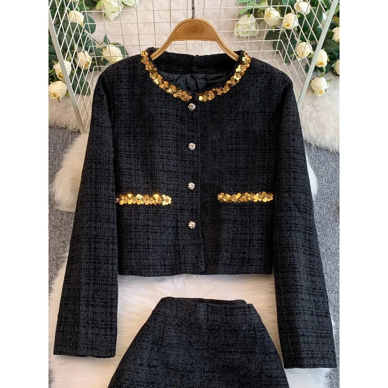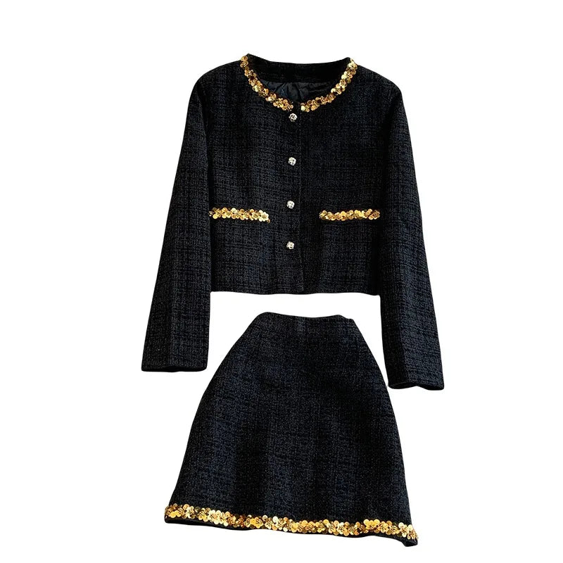 Das Clara Sequin Tweed Set kombiniert klassischen Tweed-Stil mit modernen, goldschimmernden Akzenten. Die Pailetten-Verzierungen an Kragen, Taschen und Saum verleihen dem Set einen luxuriösen Look, während die klare, leicht taillierte Silhouette für eine feminine Ausstrahlung sorgt. Das Set besteht aus einer eleganten Kurzjacke und einem passenden Rock – ideal für Events, Dinner, Feiern oder stilvolle Alltagslooks.