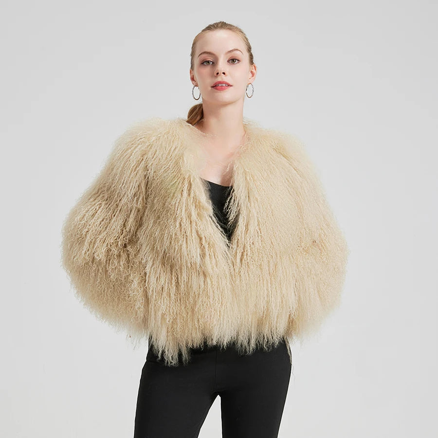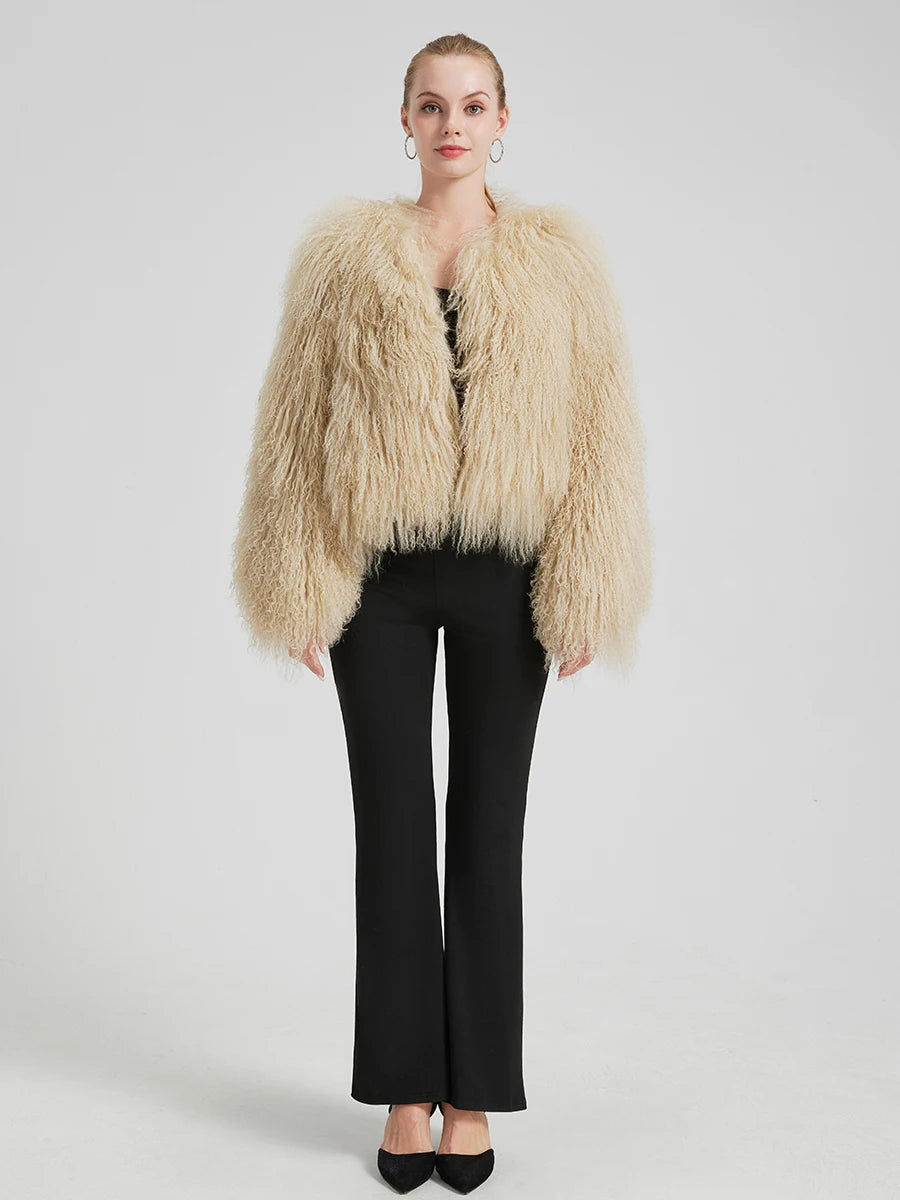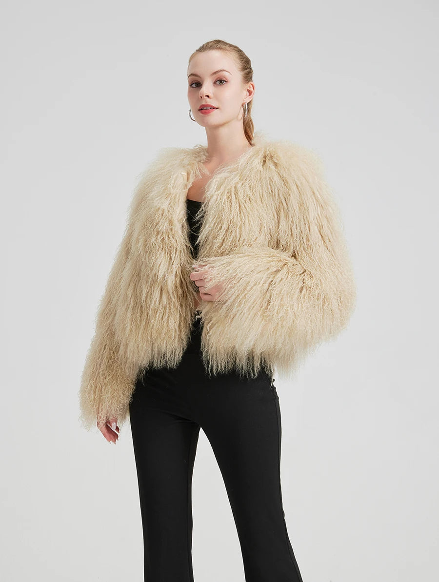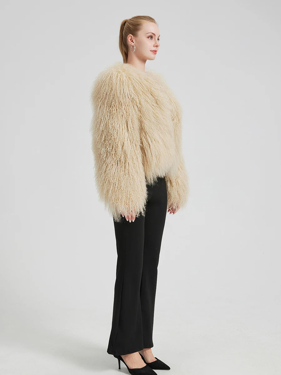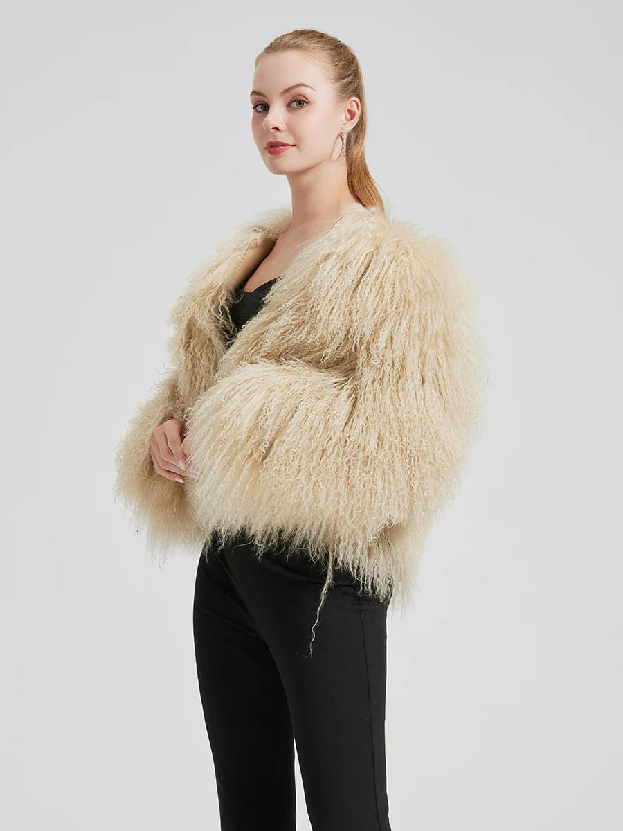 Mery - Luxuriöse Mongolische Lammfell Kurzjacke – Voluminöse Echtfell Damenjacke